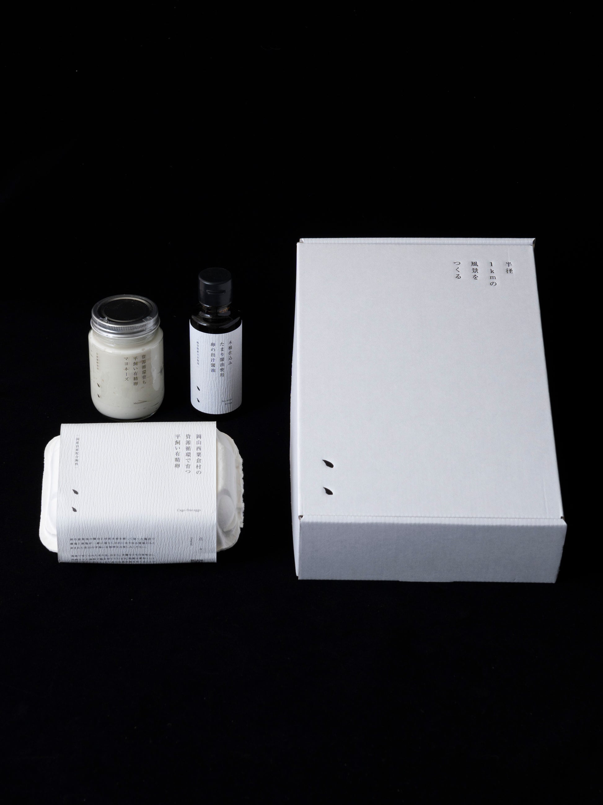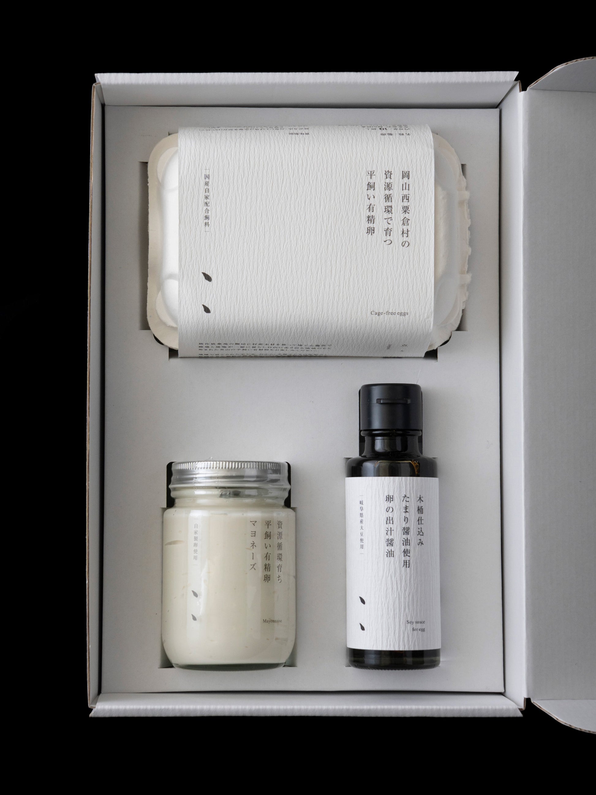 点々の平飼い有精卵と、その卵を使用したマヨネーズ、オリジナルで開発した出汁醤油を詰め合わせたギフトセットをご用意しました。