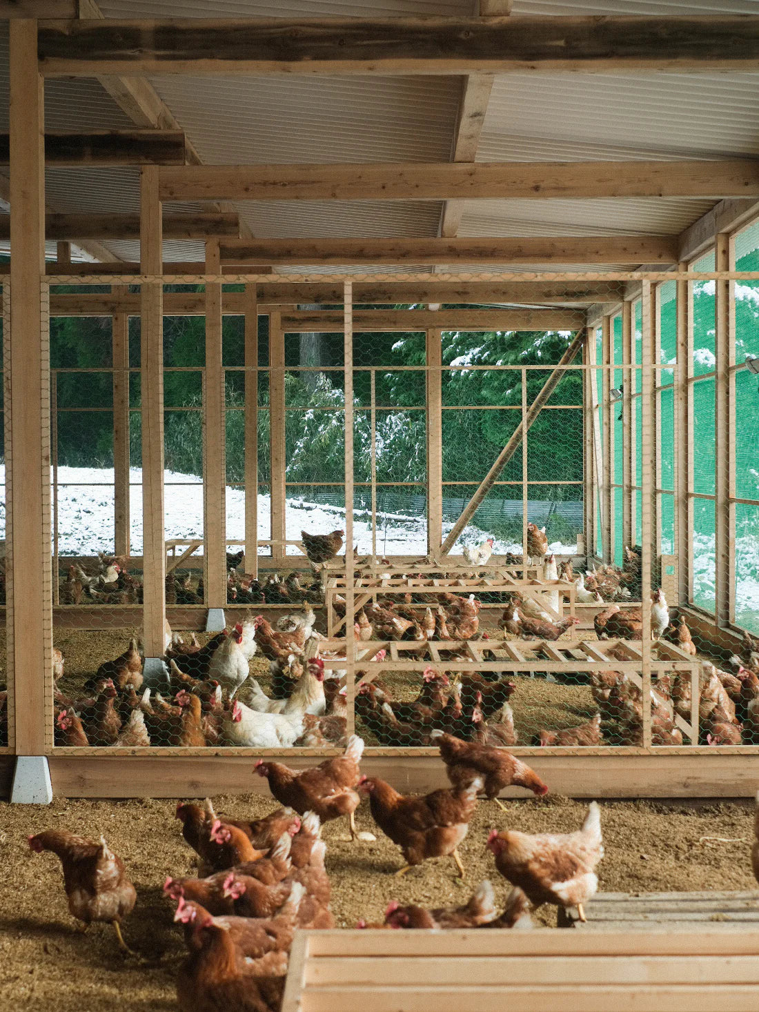 点々の卵は岡山県北東部にある西粟倉村知社集落で、耕作放棄地を活用して新しく建てた鶏舎で育てられた平飼い有精卵です。米や麦、野菜など地域の未利用資源を中心に自家配合した国産発酵飼料を与えて、ケージに入れずに鶏舎内を元気に走り回る平飼い環境で雌雄共生で産まれる有精卵は、すっきりした味わいで毎日食べても飽きない美味しさです。